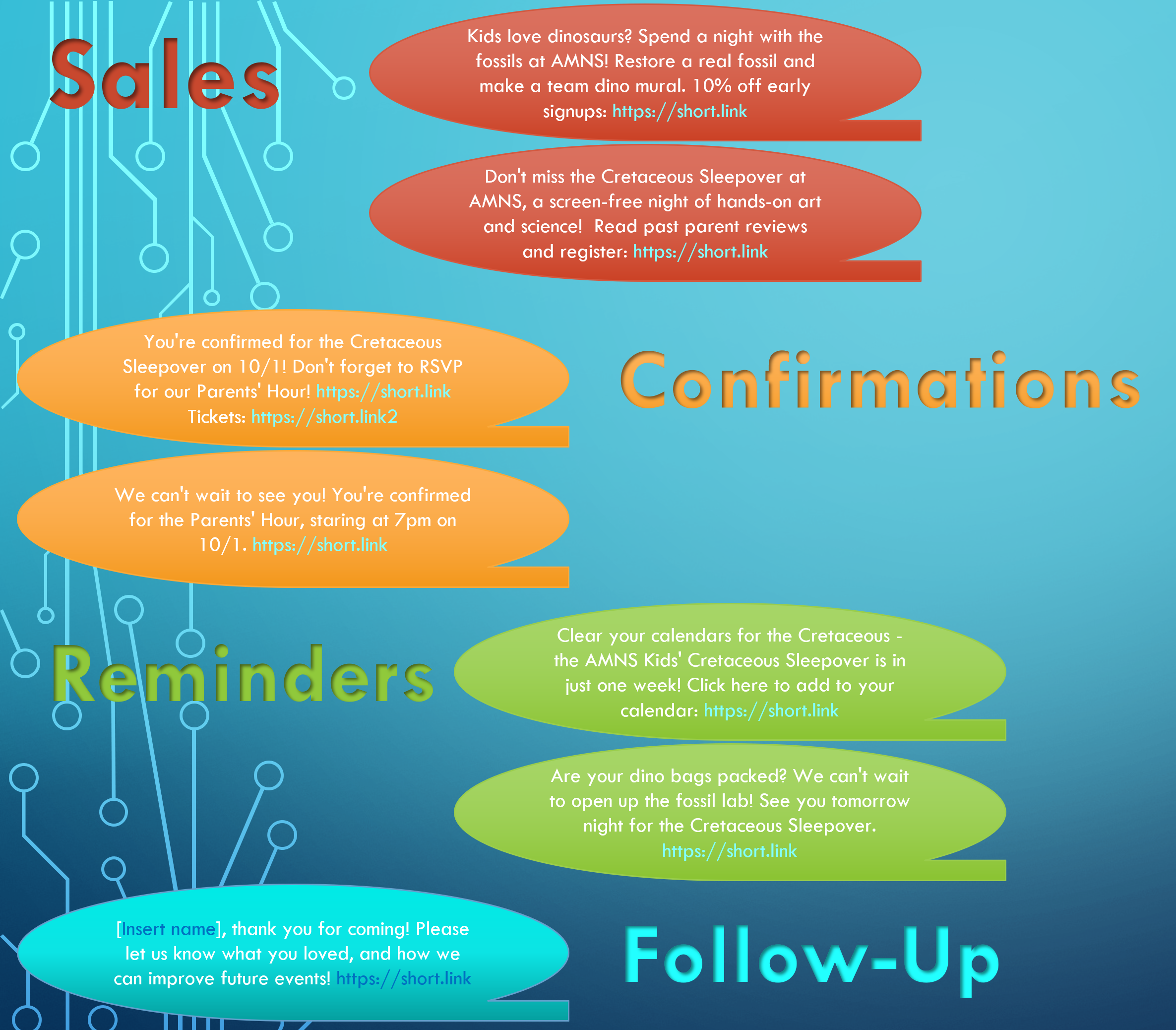 Text campaign for the Anytown Museum of Natural History Children's Cretaceous Sleepover with two reminders to sign up, including an early bird discount, and then 2 reminders leading up to the event and one follow-up. Confirmation messages should be included for both the event and the related parents' hour.